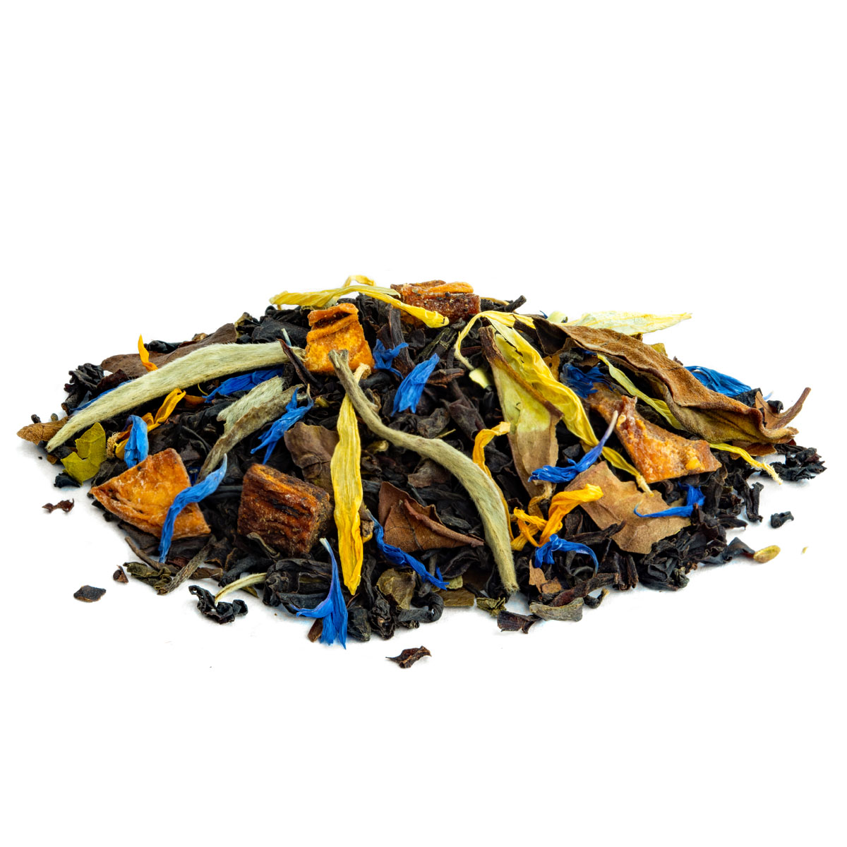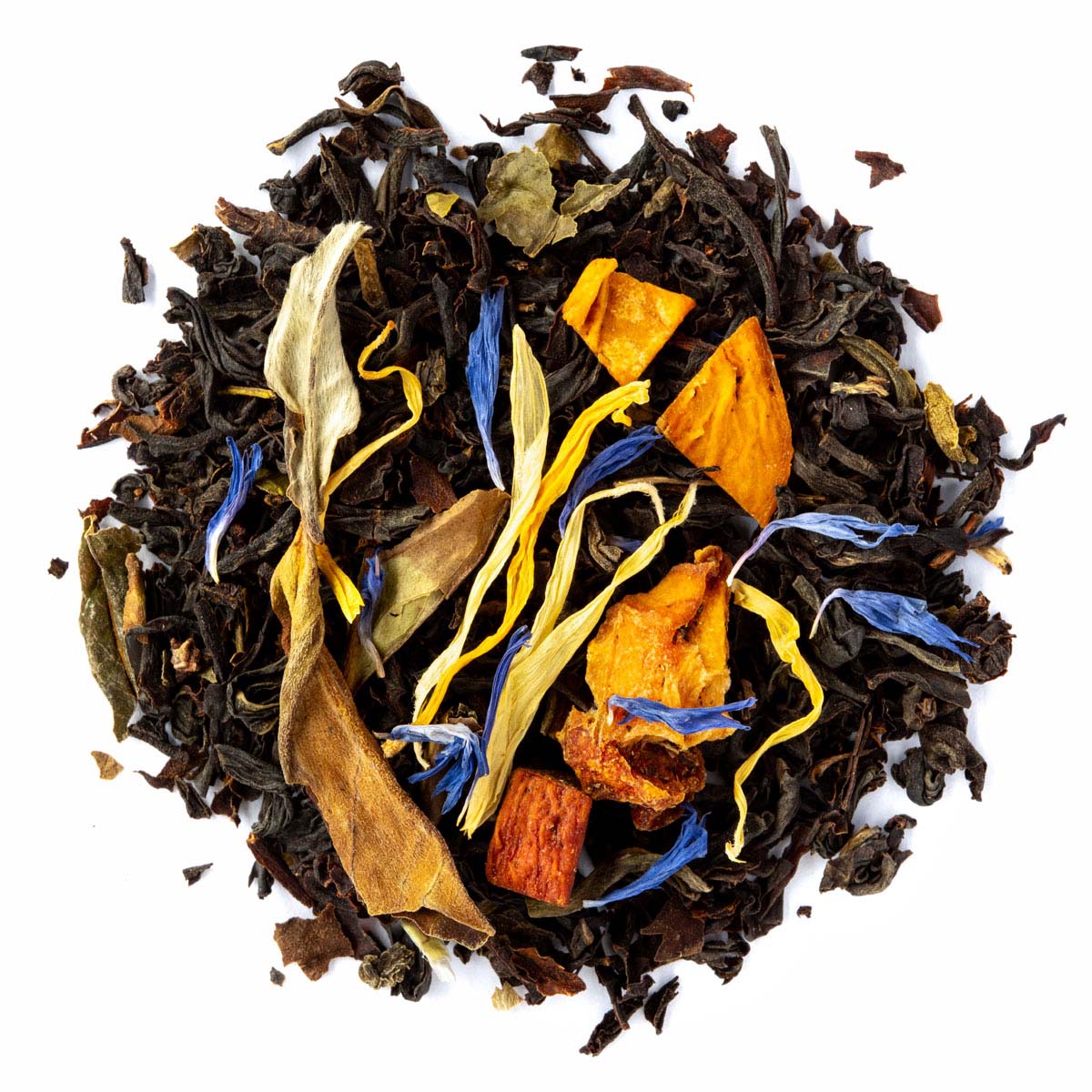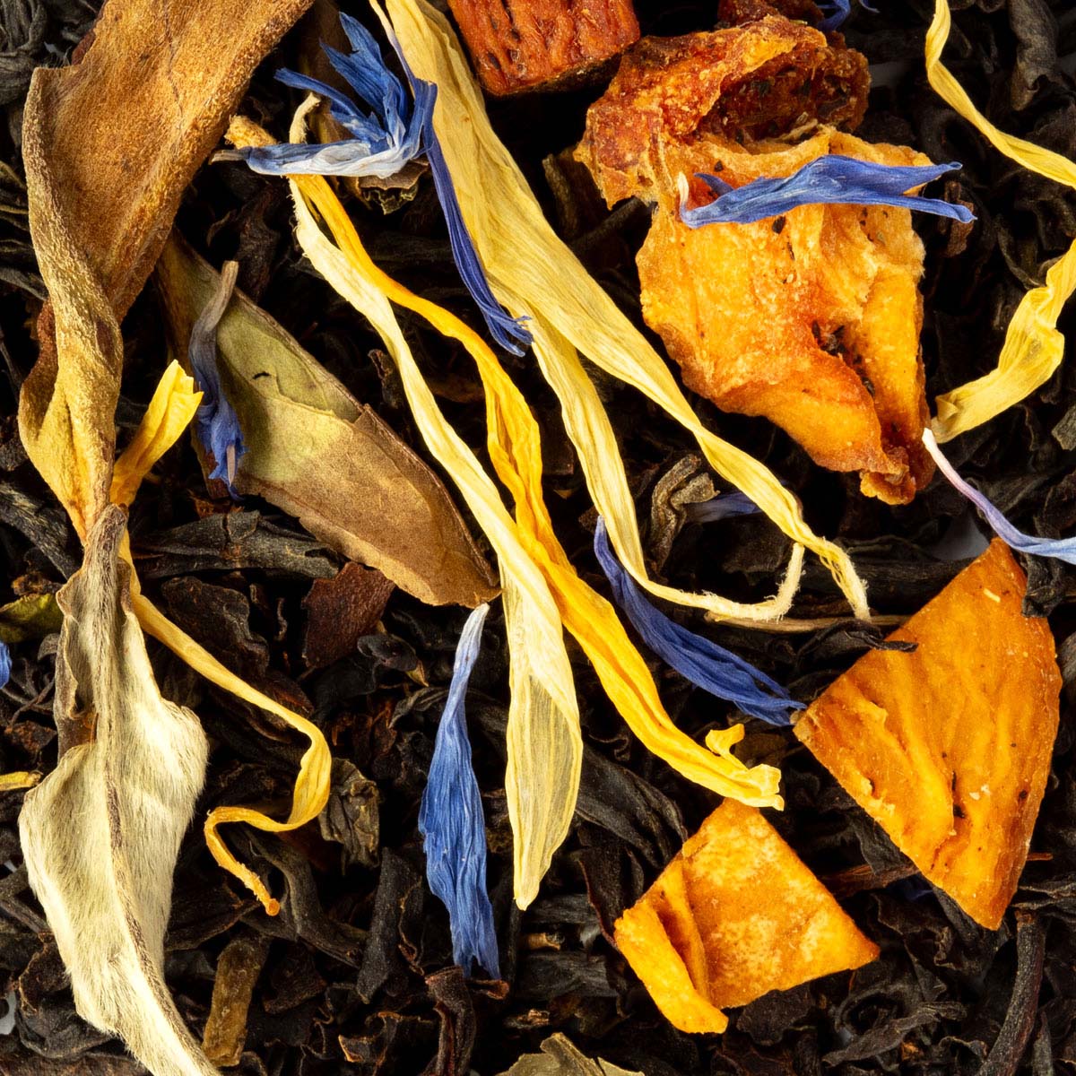 Ingredients: Black Tea Assam, -South India*, White Tea Pai Mu Tan*, Green Tea Darjeeling OP*, papaya*, mango pieces*, natural mango flavouring, natural passion fruit flavouring, natural orange flavouring, chokeberries*, marigold*, cornflower blue*, mango*. * Certified organic