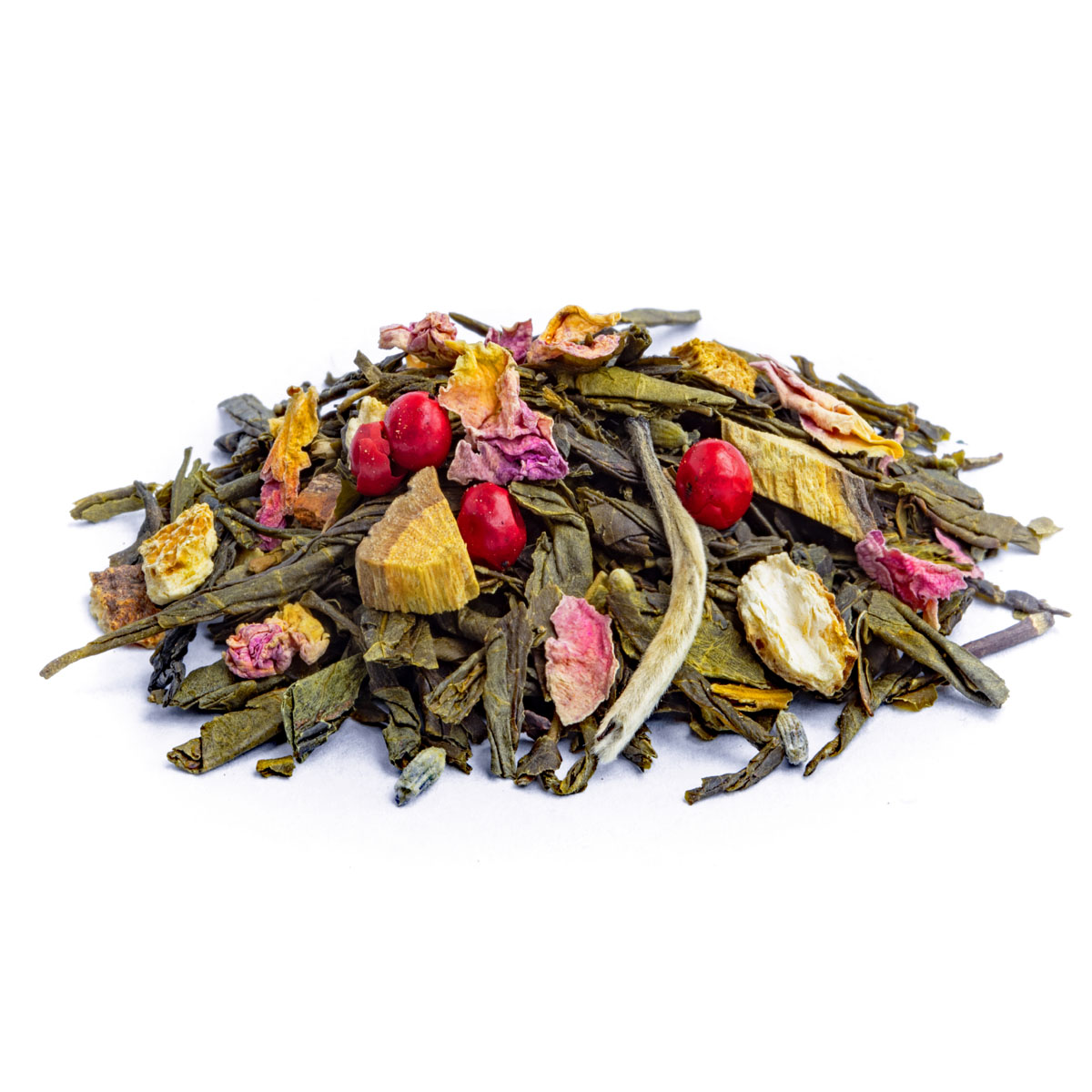 Ingredients: Green Tea China Sencha*, liquorice root*, cinnamon sticks*, orange peels*, pink pepper*, natural orange flavouring, rose petals*, lavender*, China Jasmine Silverneedle*. * Certified organic