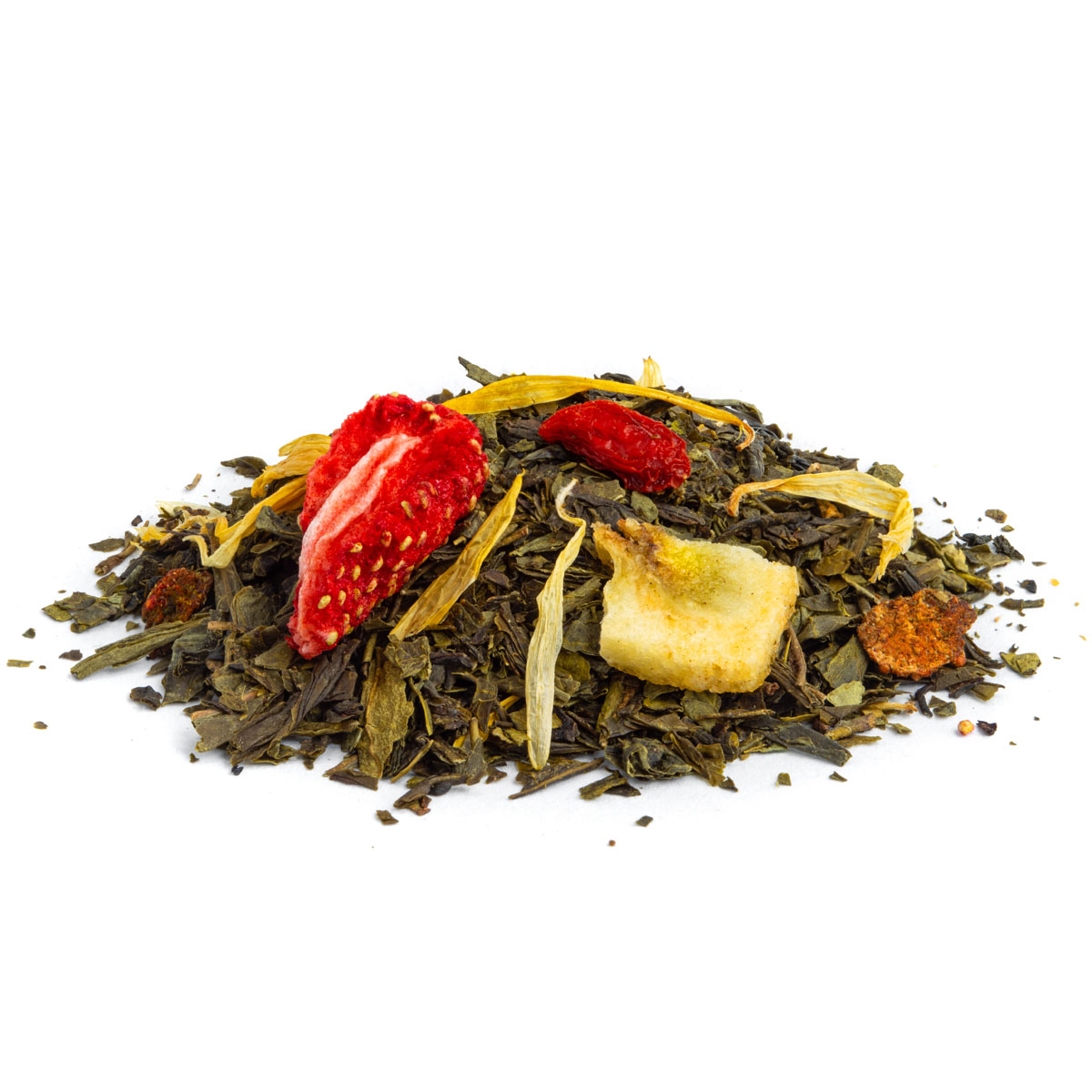 Ingredients: Green Tea China Sencha*, banana (banana, coconut oil, cane sugar, honey)*, natural strawberry flavouring, natural mango flavouring, marigold*, strawberry*, natural orange flavouring, pineapple*, apricot*. * Certified organic
