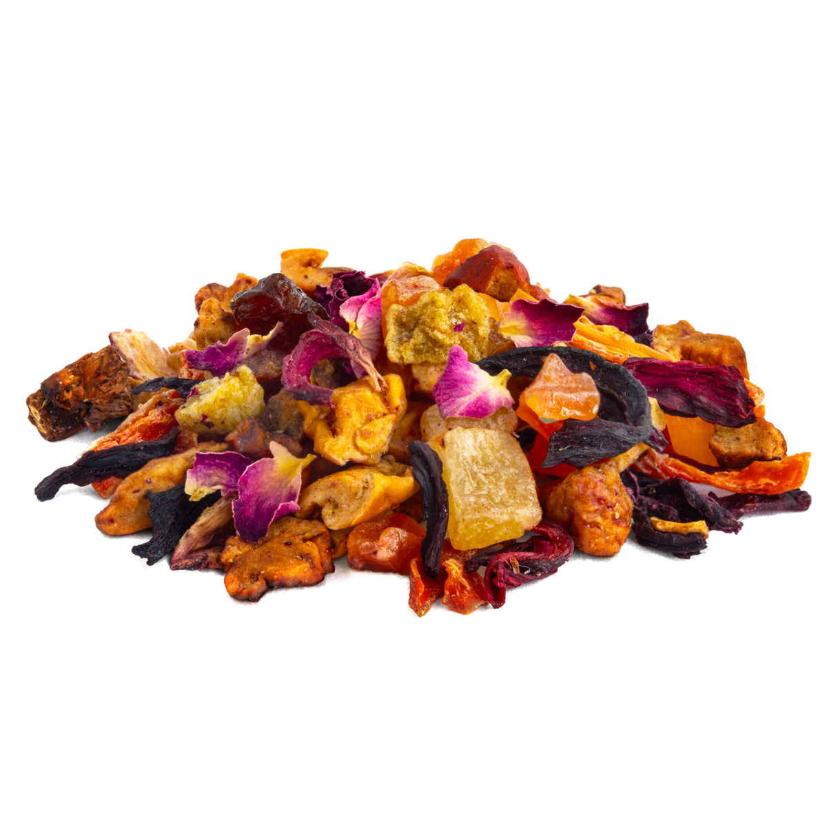 Ingredients: Apple, grape (grape, vegetable oil), hibiscus, pineapple (pineapple, sugar), mango (mango, sugar), carrot, papaya (papaya, sugar), beetroot, natural flavouring, lemon pieces, kiwi slices, rose petals.