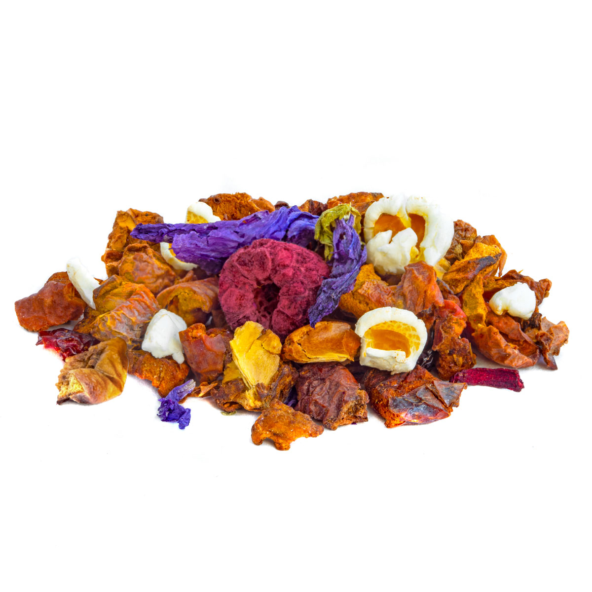 Ingredients: Apple, rose hip, natural flavouring, hibiscus, raspberry (4%), CARAMEL (SUGAR, GLUCOSE SYRUP, CREAM, BUTTER, GUÉRANDE SALT) , popcorn, mallow.