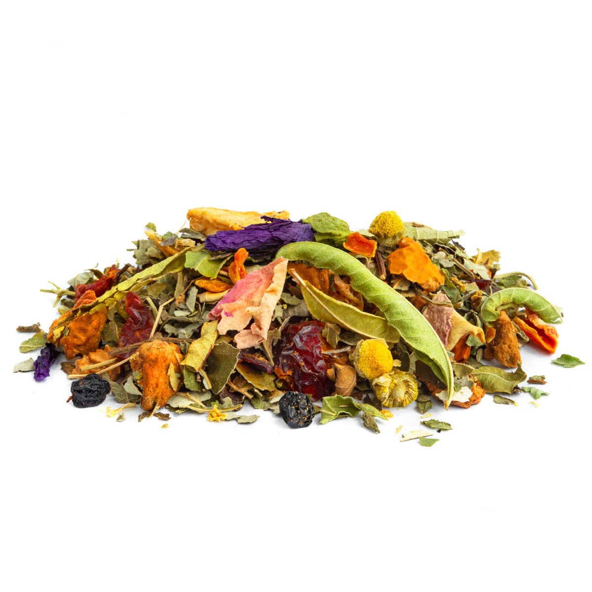 Ingredients: Apple, blackberry leaves, rose hip, carrot, balm, natural flavouring, verbena whole, elderberry (3%), elderflowers (3%), camomile, lemon myrtle, rose petals, meadowsweet, mallow.