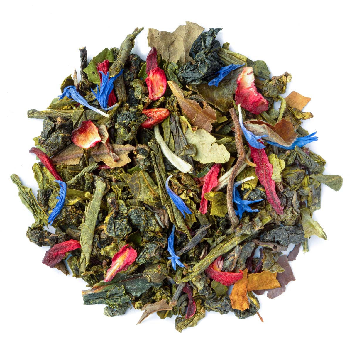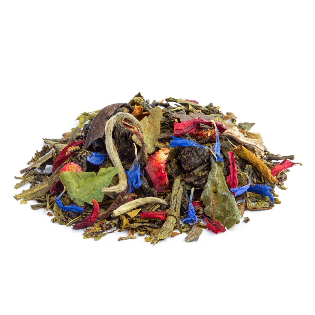 Ingredients: China Oolong, Green Tea China Sencha, White Tea Pai Mu Tan, hibiscus, natural flavouring, pomegranate, acai, cornflower blue.